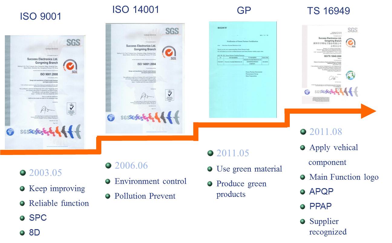 Quality First and Customer First is the eternal responsibility of SUCCESS. The company follows the guidelines of ISO9001 and ISO14001, from product design to the IQC and manufacturing process control, from goods shipments to recycling, all comply with the requirements of environmental protection and in line with EU ROHS standards. The company has launched a project to upgrade the automation of production lines to make the contact with product as little as possible , lowering the ratio of man-made defect factors.